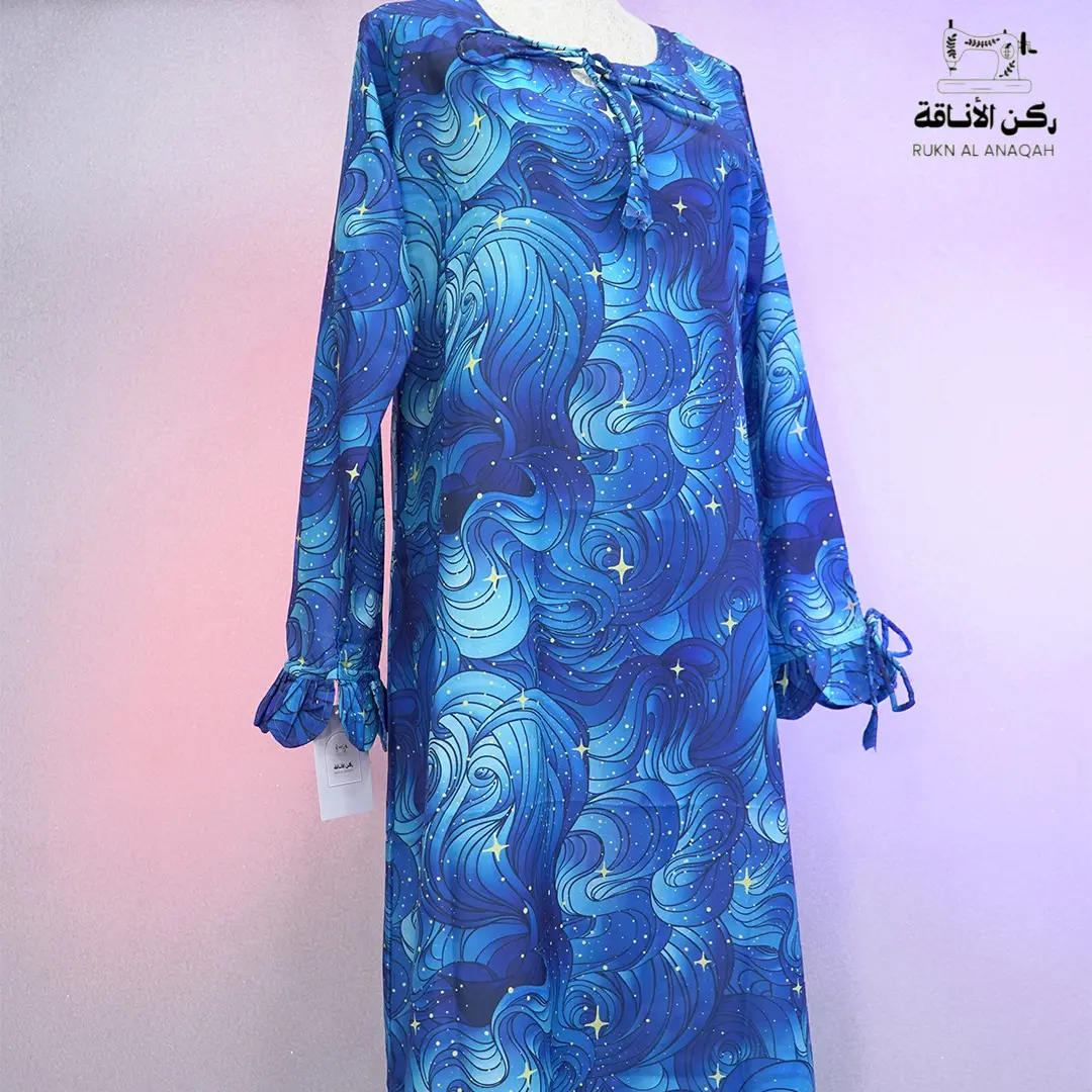 . The fabric is uniquely designed, printed, and tailored by our own workshop — not available in the market. Every piece is handcrafted with attention to detail, making each jalabiya a wearable piece of art. ✦ Flowing, soft, and breathable fabric for maximum comfort ✦ Ruffled cuffs with tie details for a feminine finish ✦ Adjustable neckline with a matching fabric string A garment infused with creativity and craftsmanship, made to wrap you in elegance and individuality.